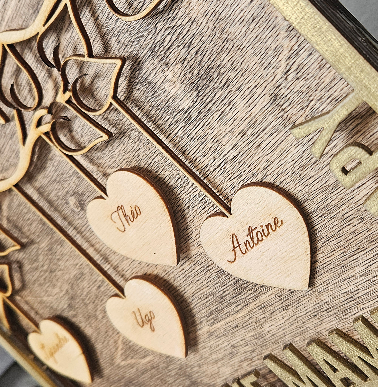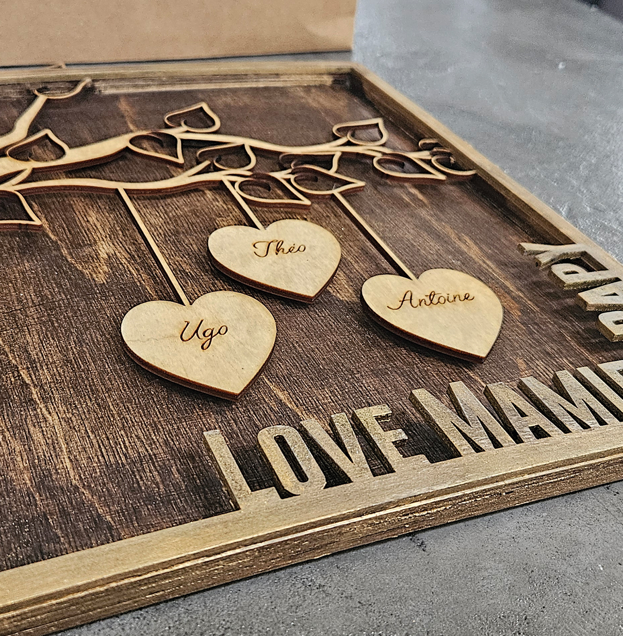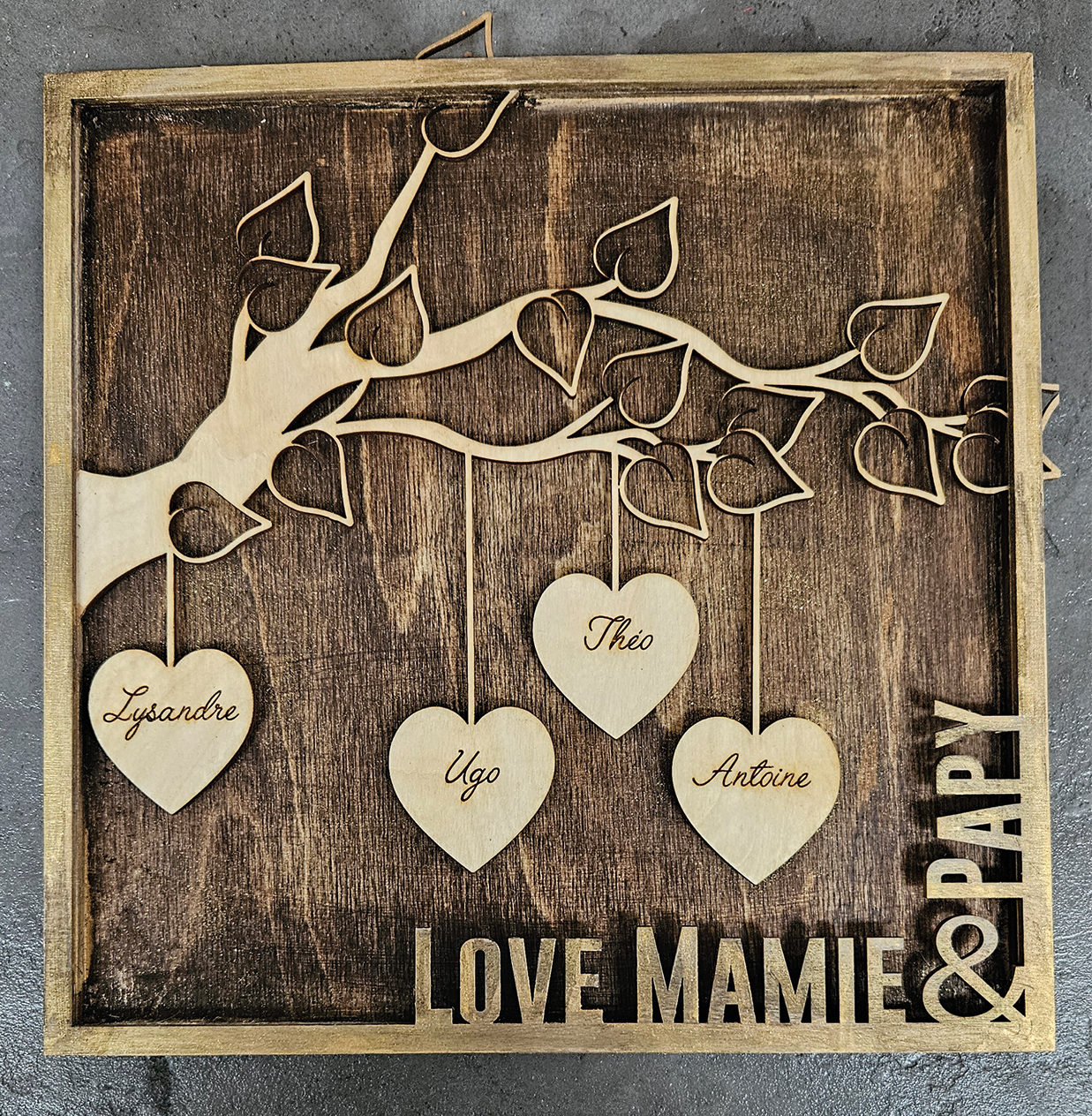 demande d'un cadre pour offrir à papy et mamy reprenant le nom des petits enfants. Création de A à Z en fonction des directives du client