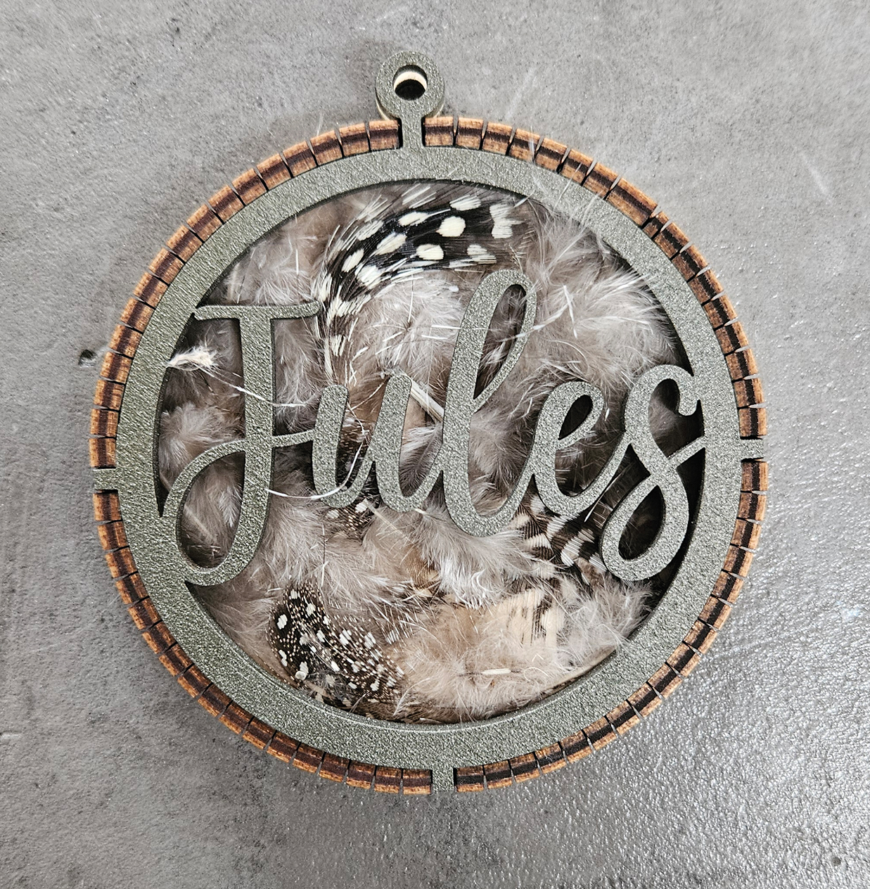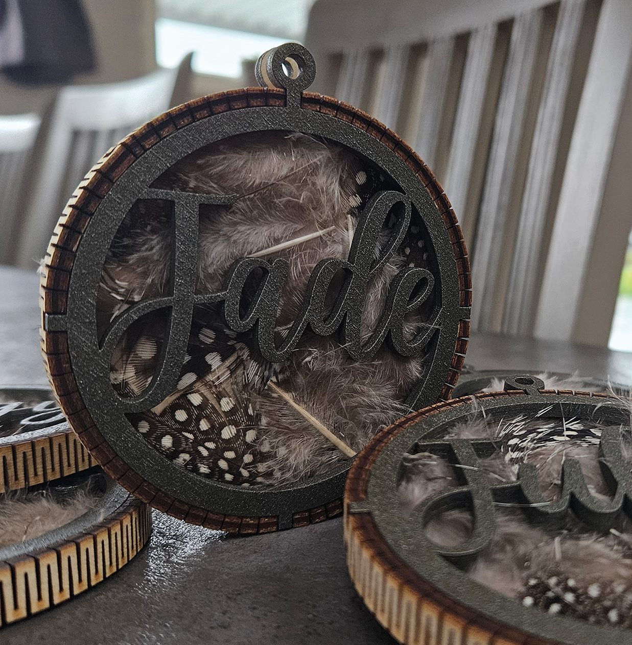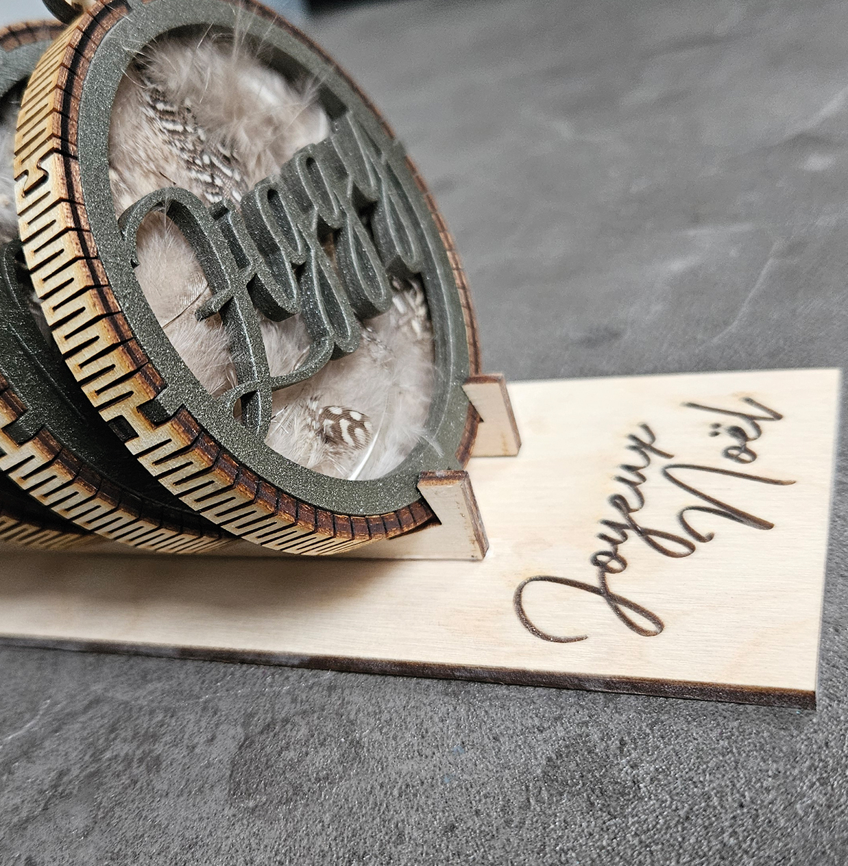 création de plusieurs boules de Noêl sur le même thème avec chaque membre de la famille. les découpes et gravures sont réalisées avec le laser CO2. Montage avec de véritables plumes de perdrix